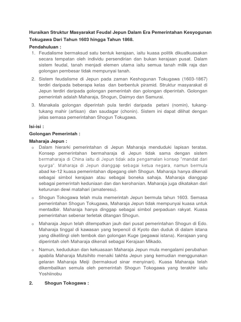 Huraikan Struktur Masyarakat Feudal Jepun Dalam Era Pemerintahan Kesyogunan Tokugawa Dari Tahun 1603 Hingga Tahun 1868 Pdf